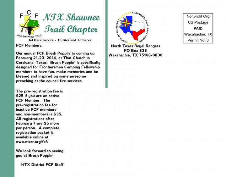 The North Texas Royal Rangers chapter of the Frontiersmen Camping Fellowship (FCF), known as the the NTX Shawnee Trail Chapter, hold an annual Brush Poppin’ Trace every year for members of FCF. The theme for the 2014 event was, To The Wilderness.