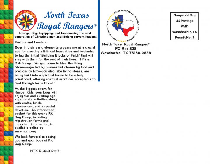 This postcard I created for the 2018 Ranger Kids Day Camp, held annually in September. The theme for the day event was “Building Blocks of Faith”, a Lego®-based theme.