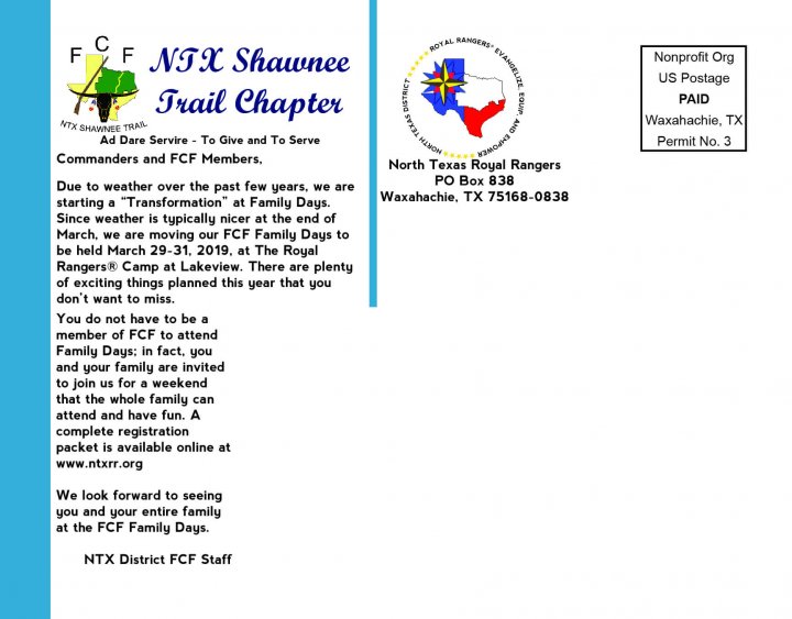 This postcard I created for the 2019 FCF Family Days. The event historically was held in mid- to late-October, but due to weather issues the past few years, it has been moved to the end of March. The theme for the event is “Transformation”.
